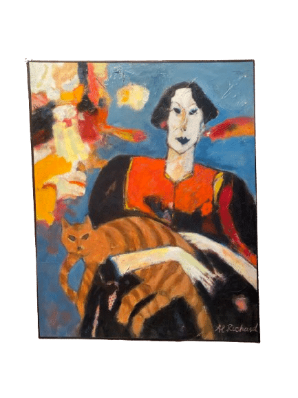 Peinture signée Al Richard portrait d'une femme portant un chat.