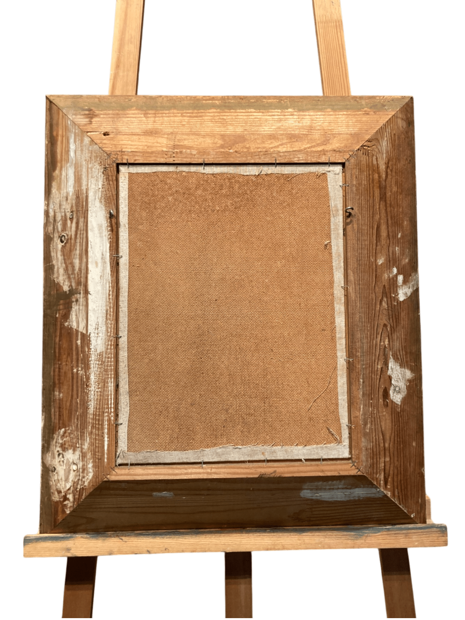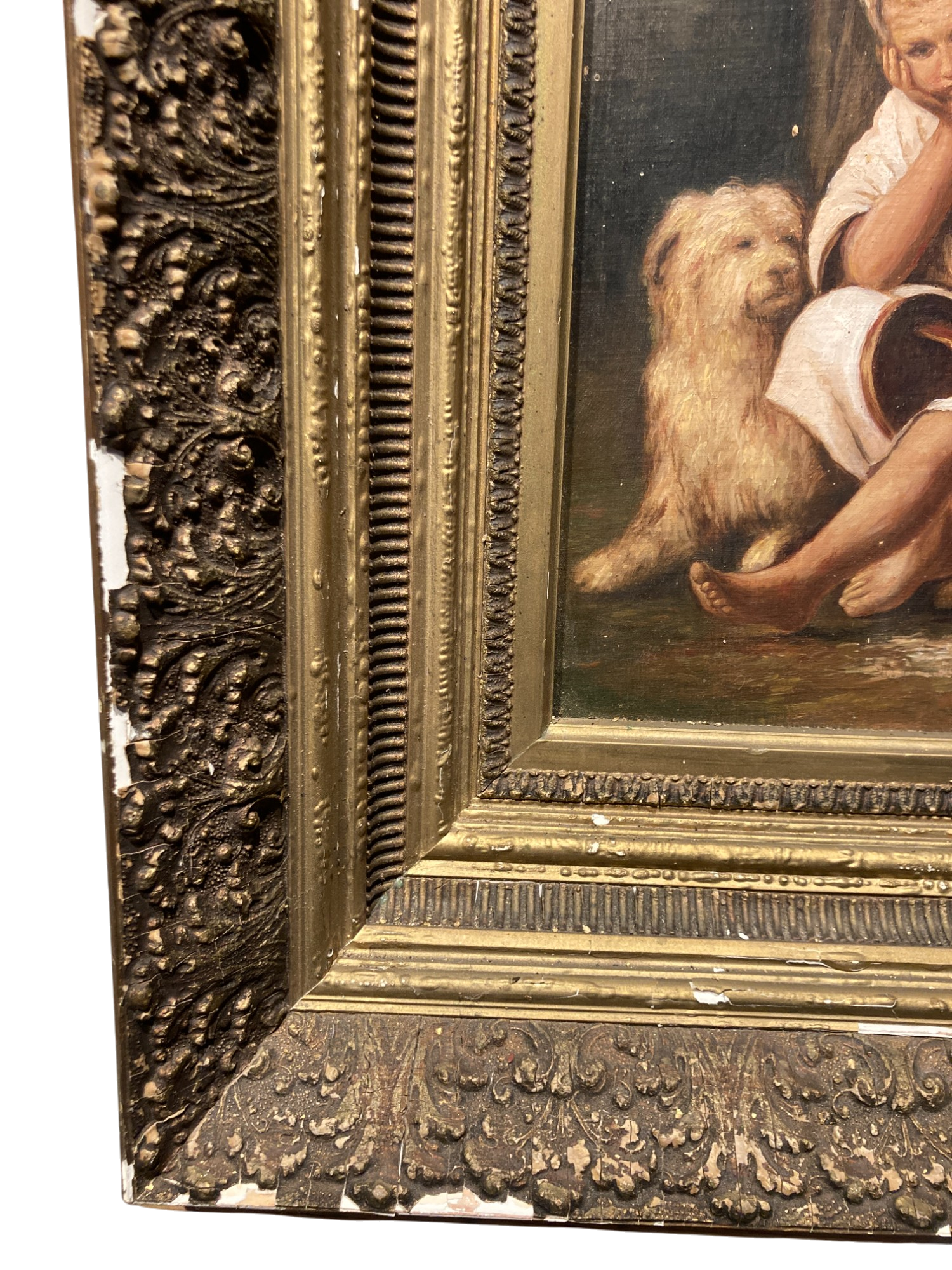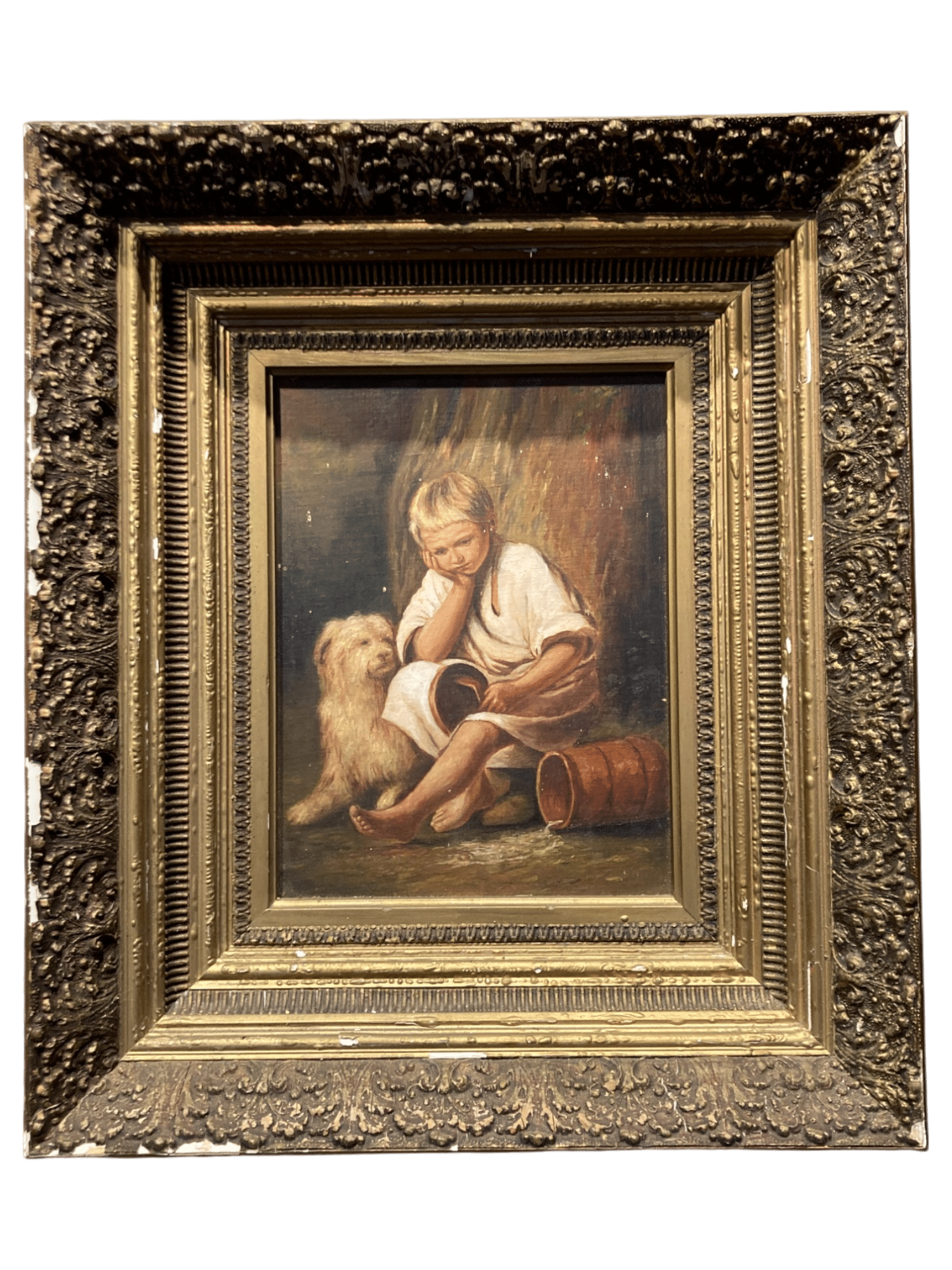 Peinture sur toile encadrée d'un jeune homme et son chien.