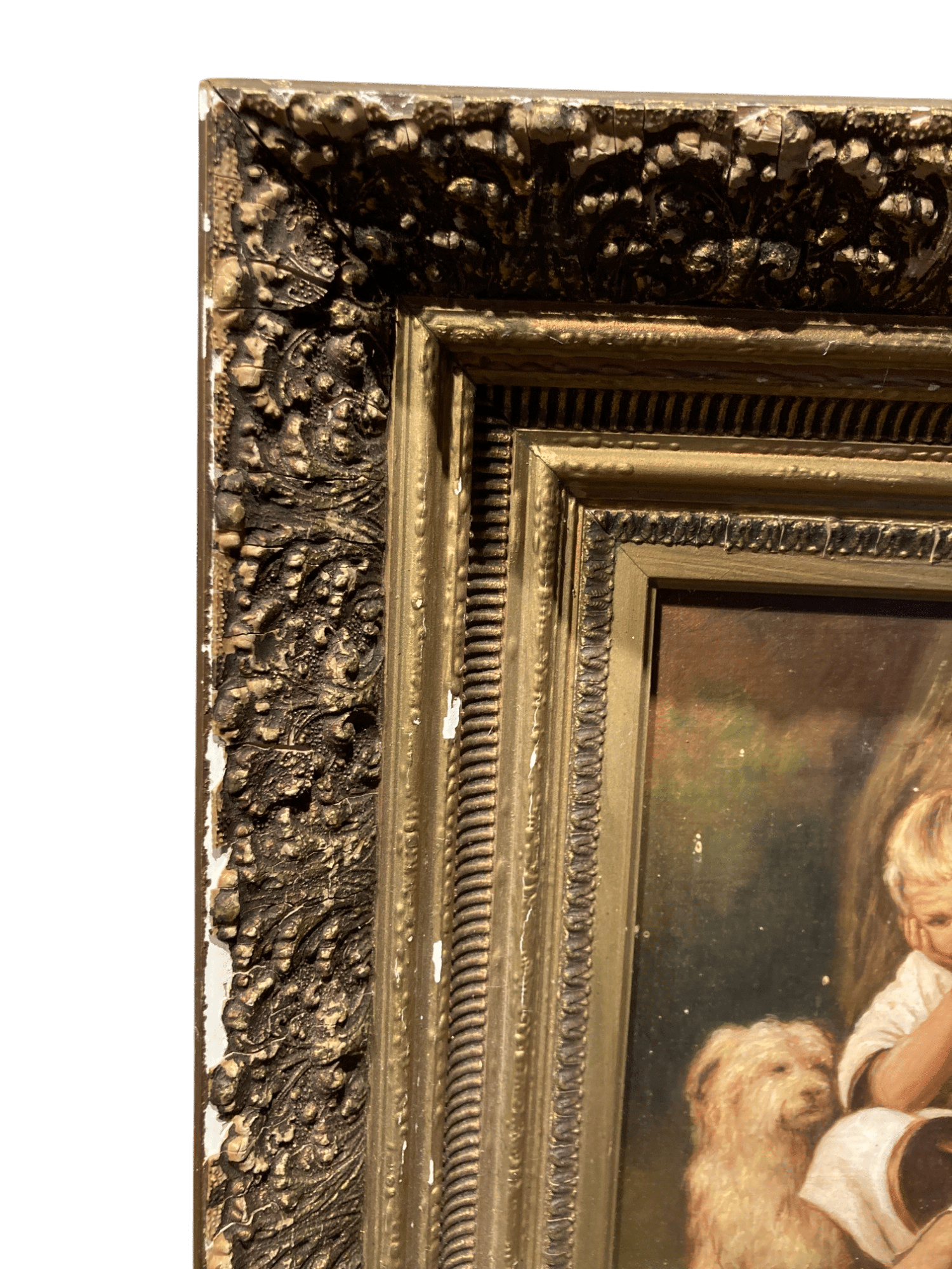 Peinture sur toile encadrée d’un jeune homme et son chien