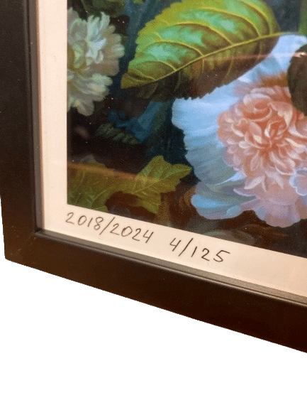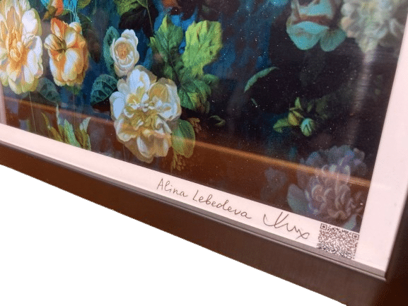 QR code en bas à gauche et signature de l'artiste en bas à droite. Le QR code renvoie au certificat d'authenticité.