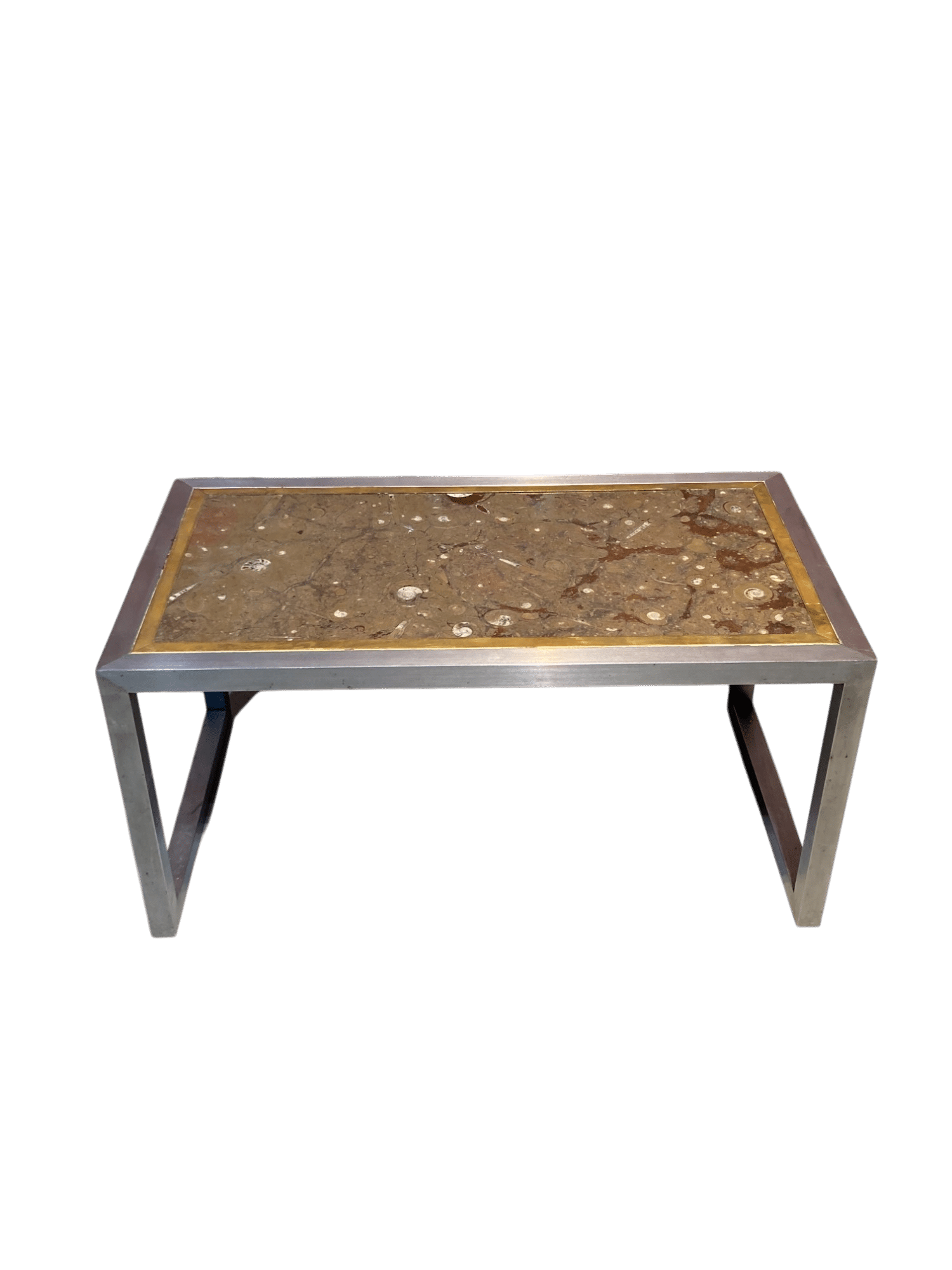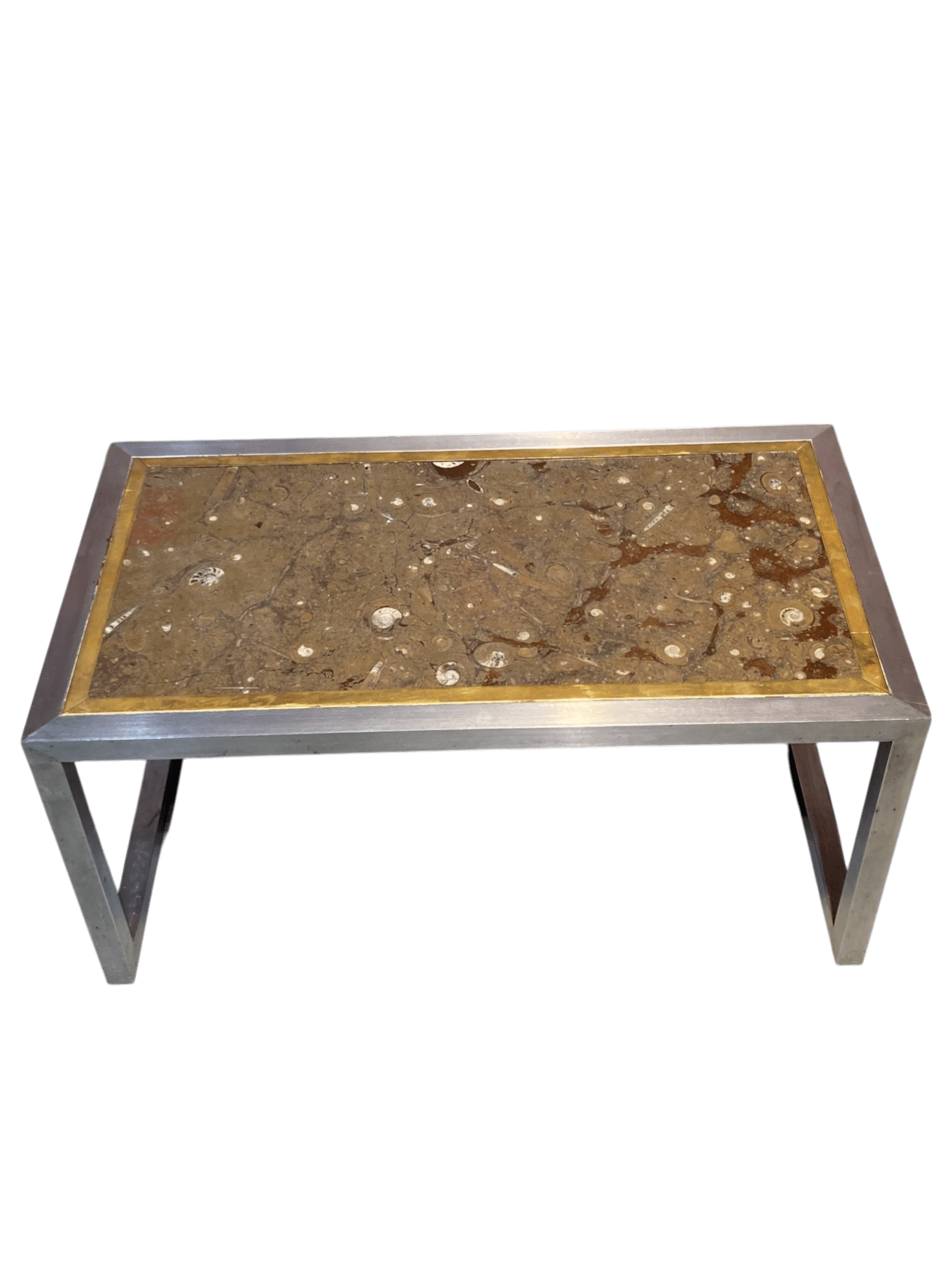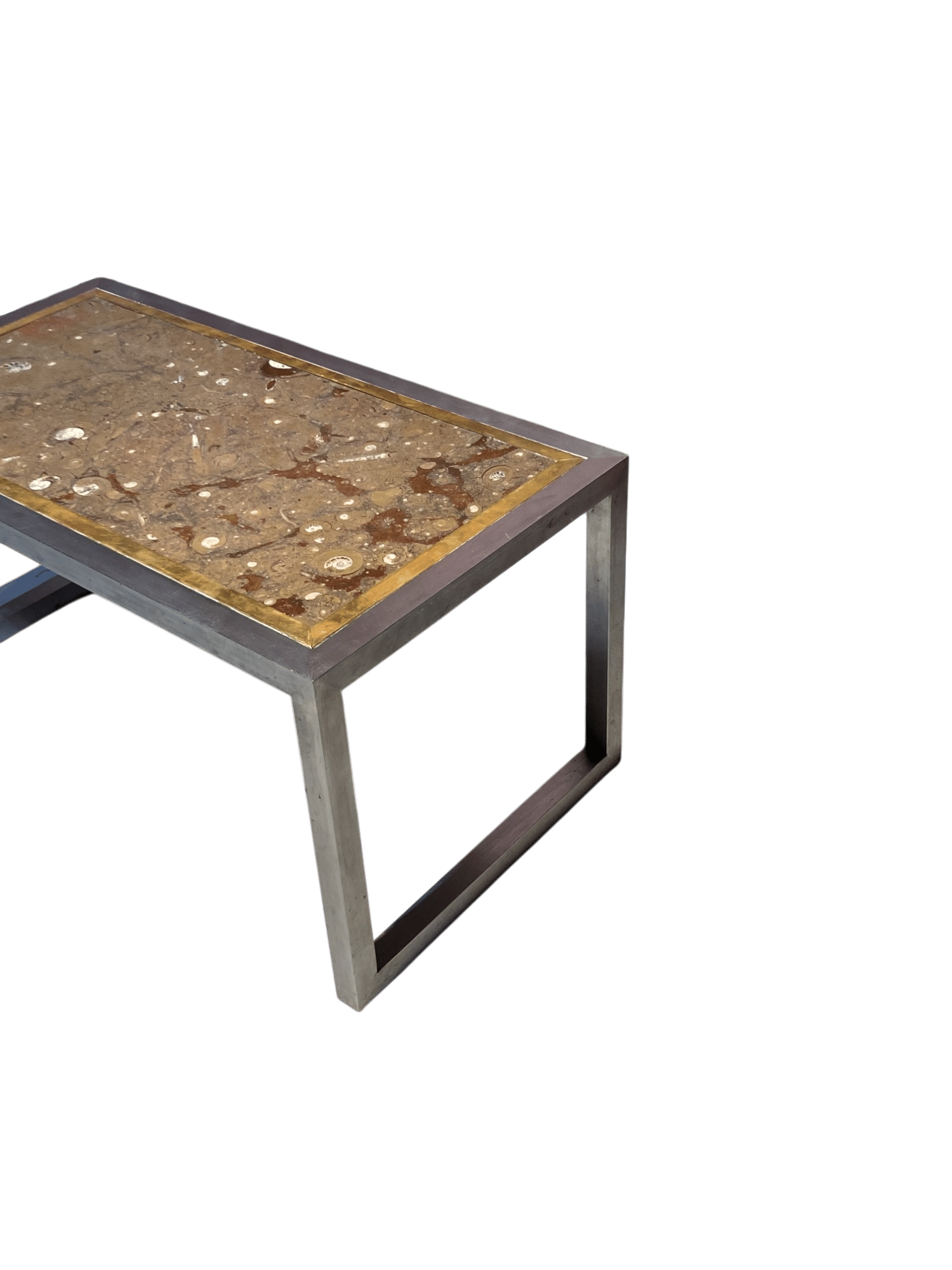 Table basse avec plateau constitué d'une plaque de pierre fossilisée.