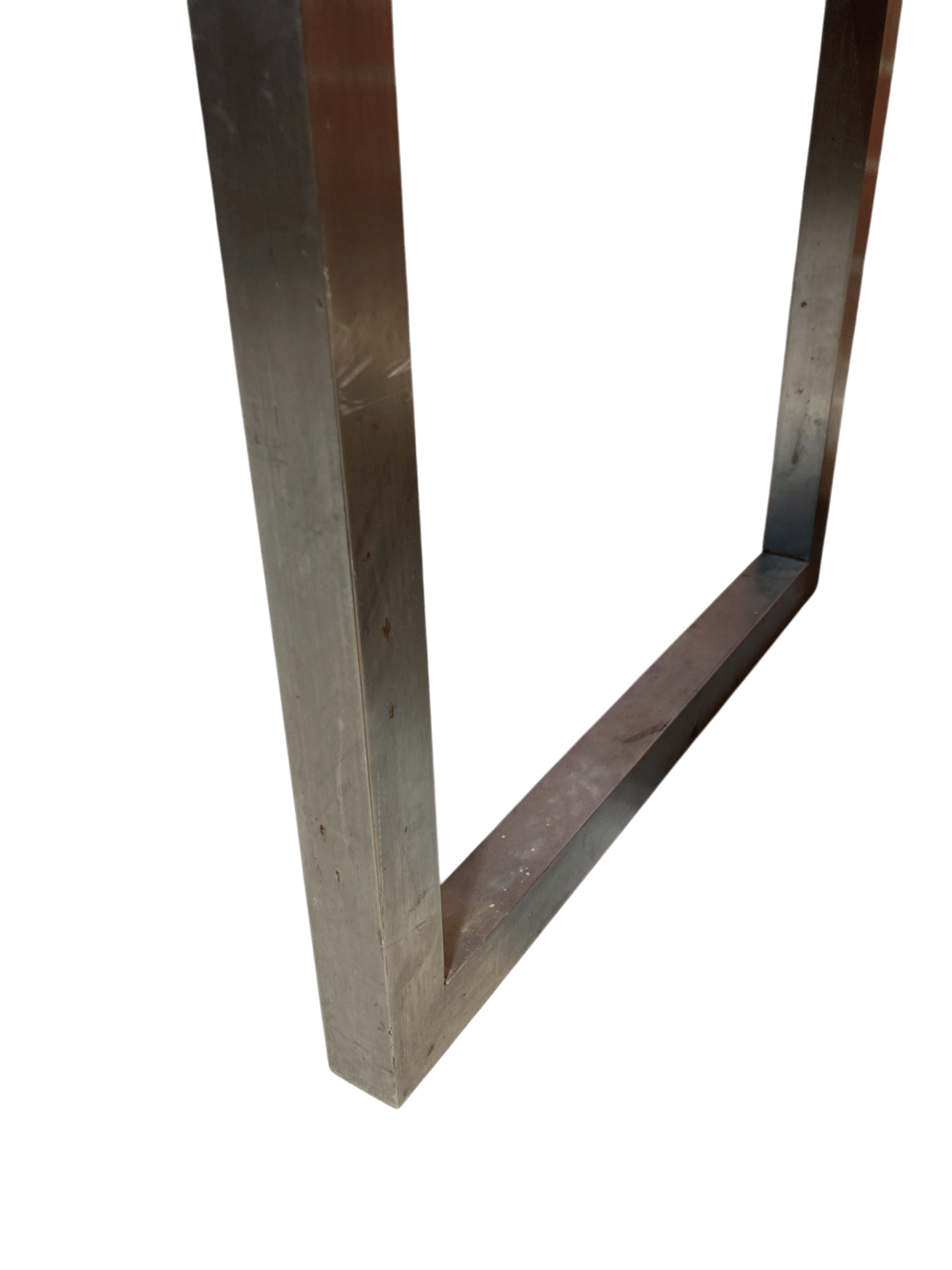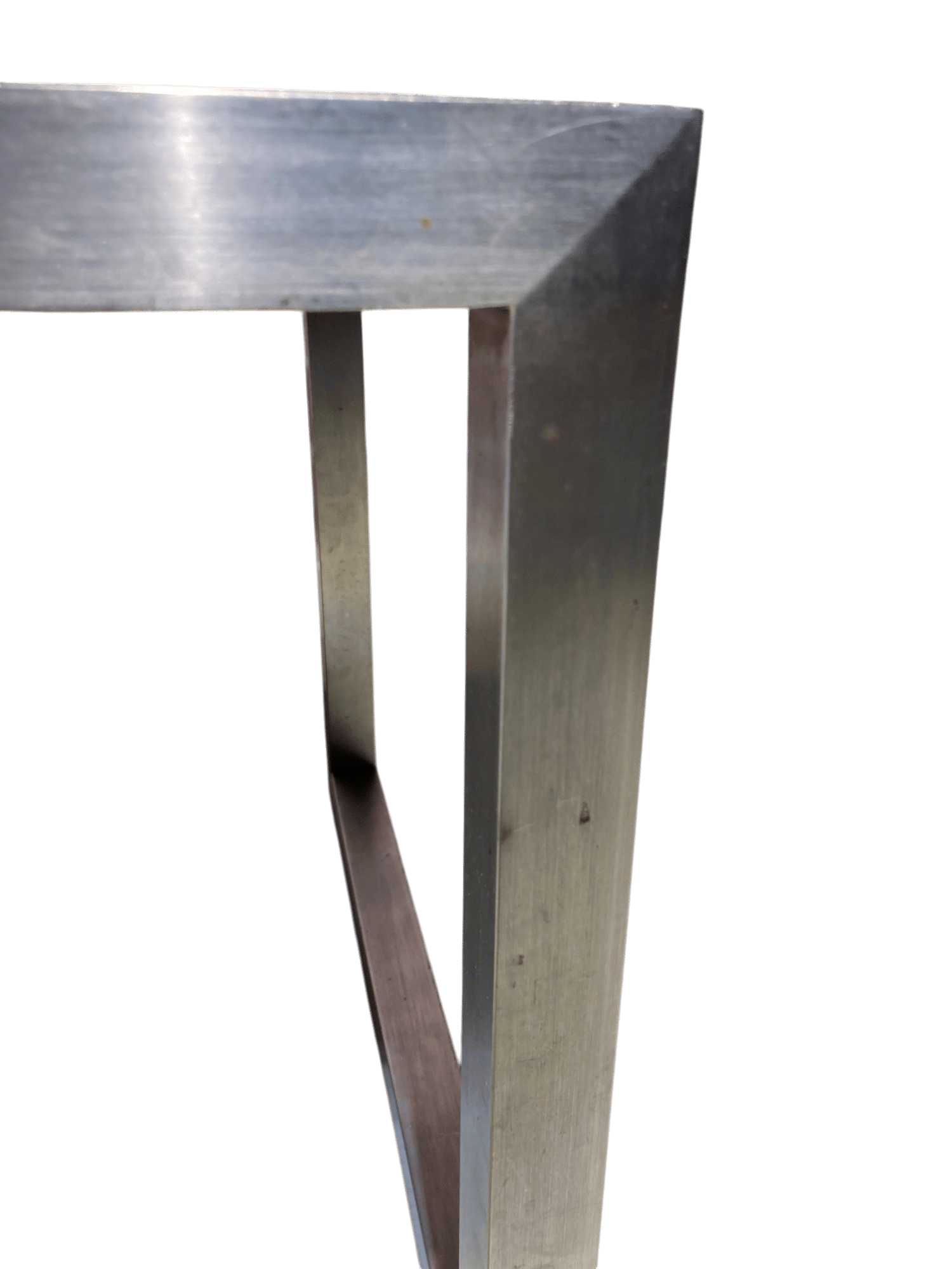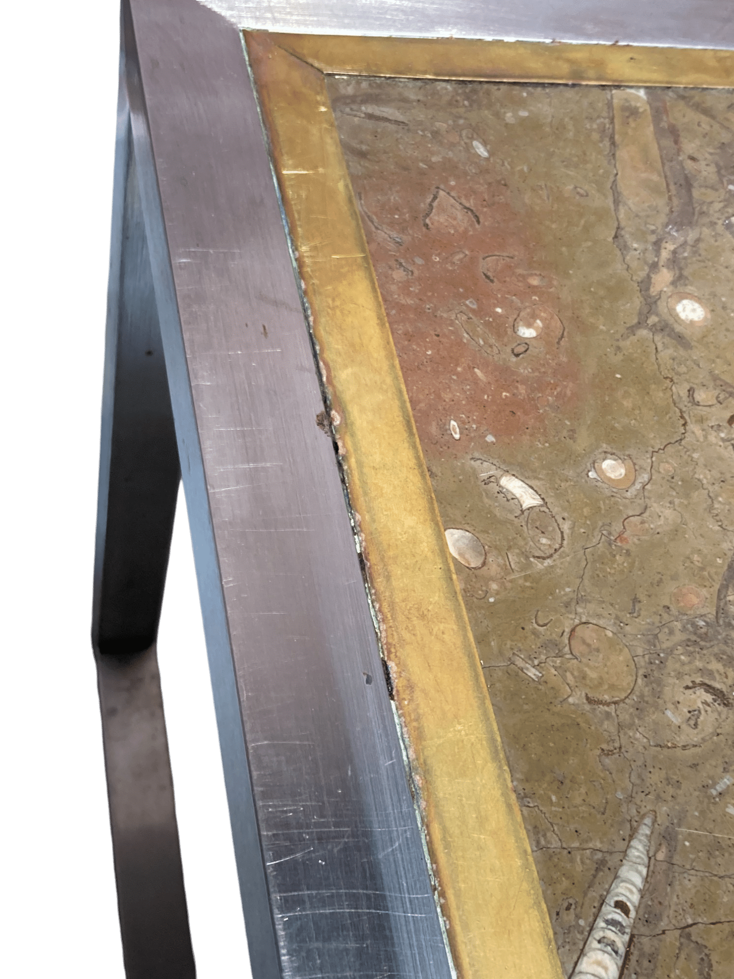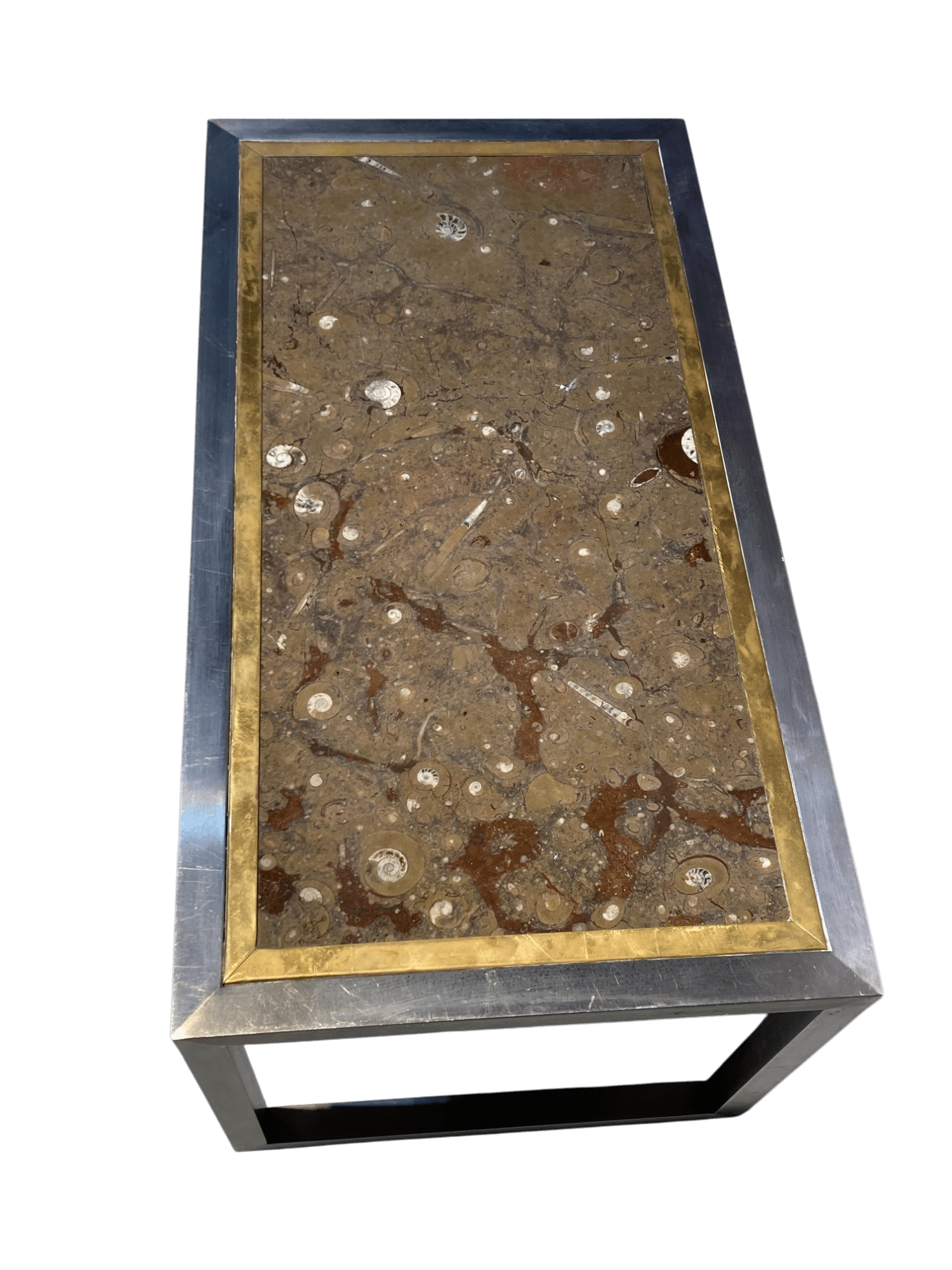 Table basse avec plateau constitué d'une plaque de pierre fossilisée.