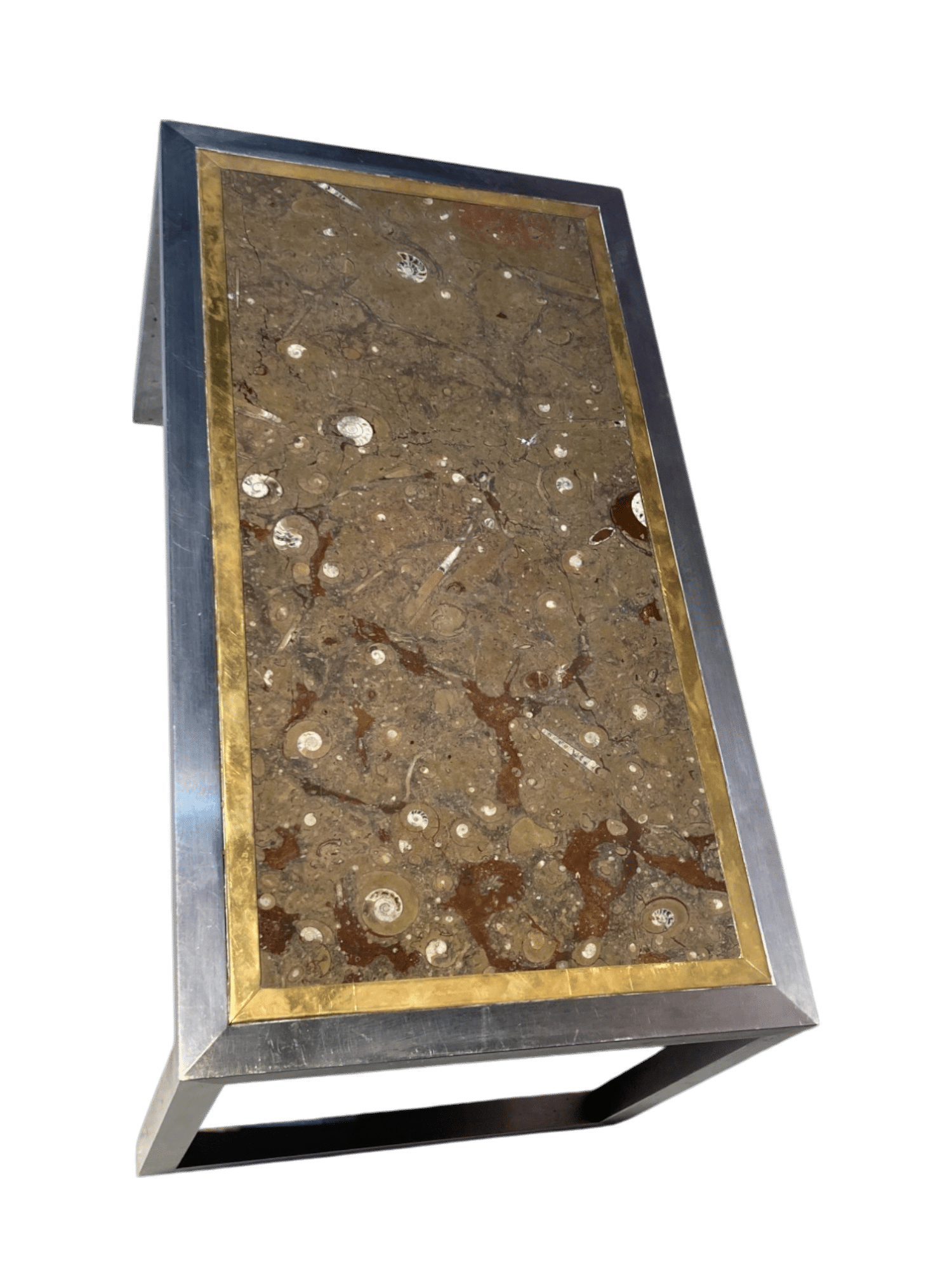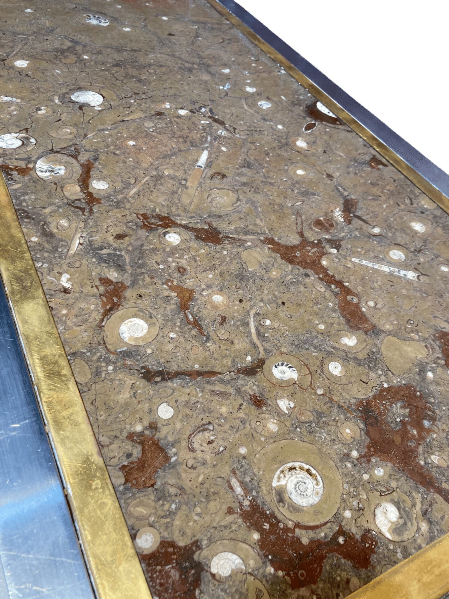 Table basse avec plateau constitué d’une plaque de pierre fossilisée