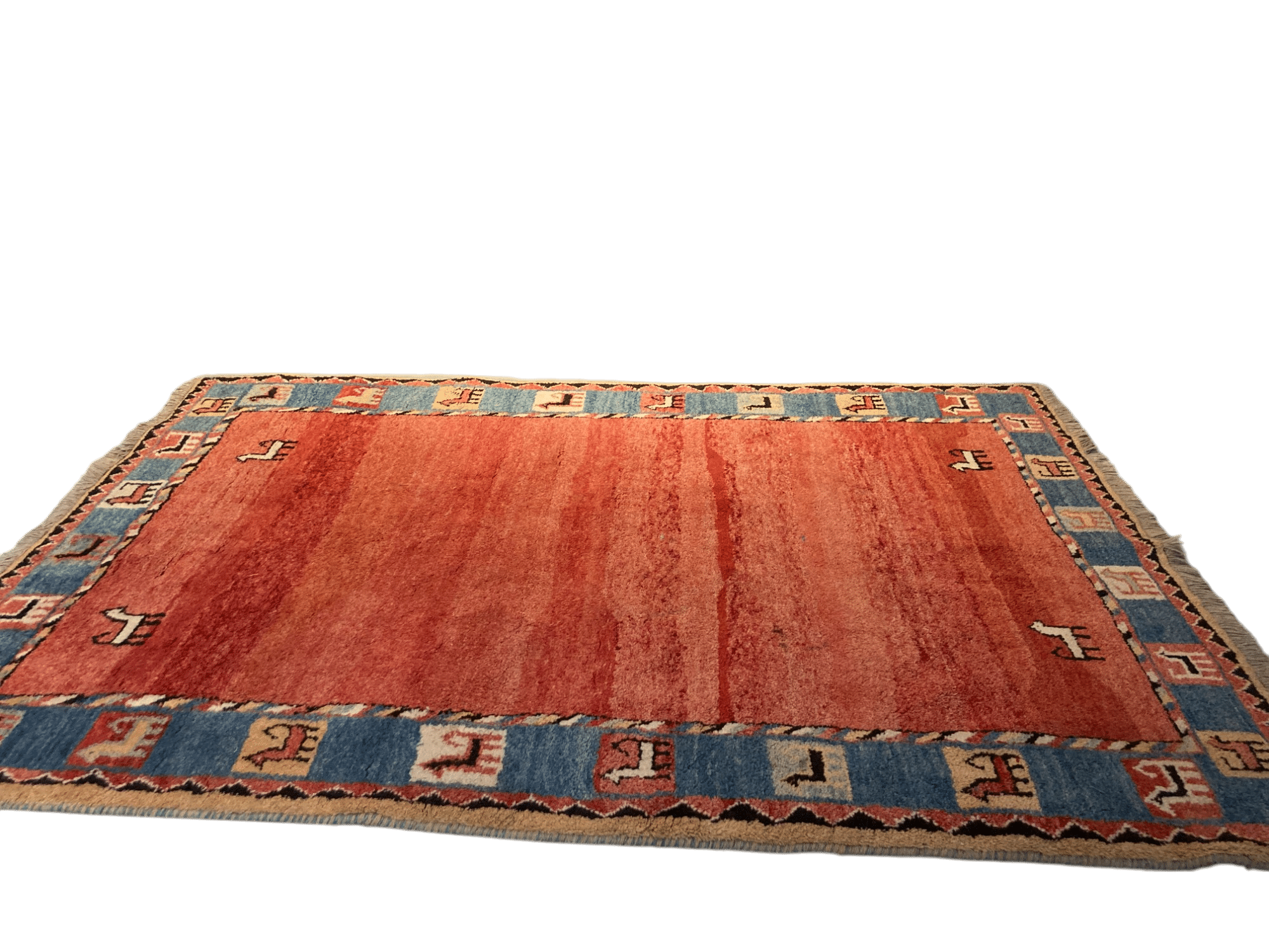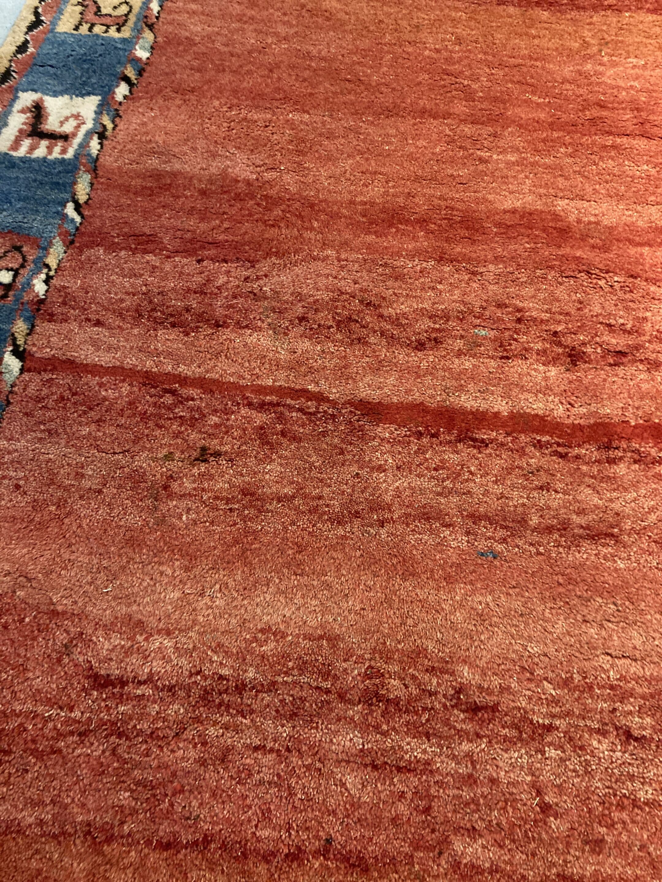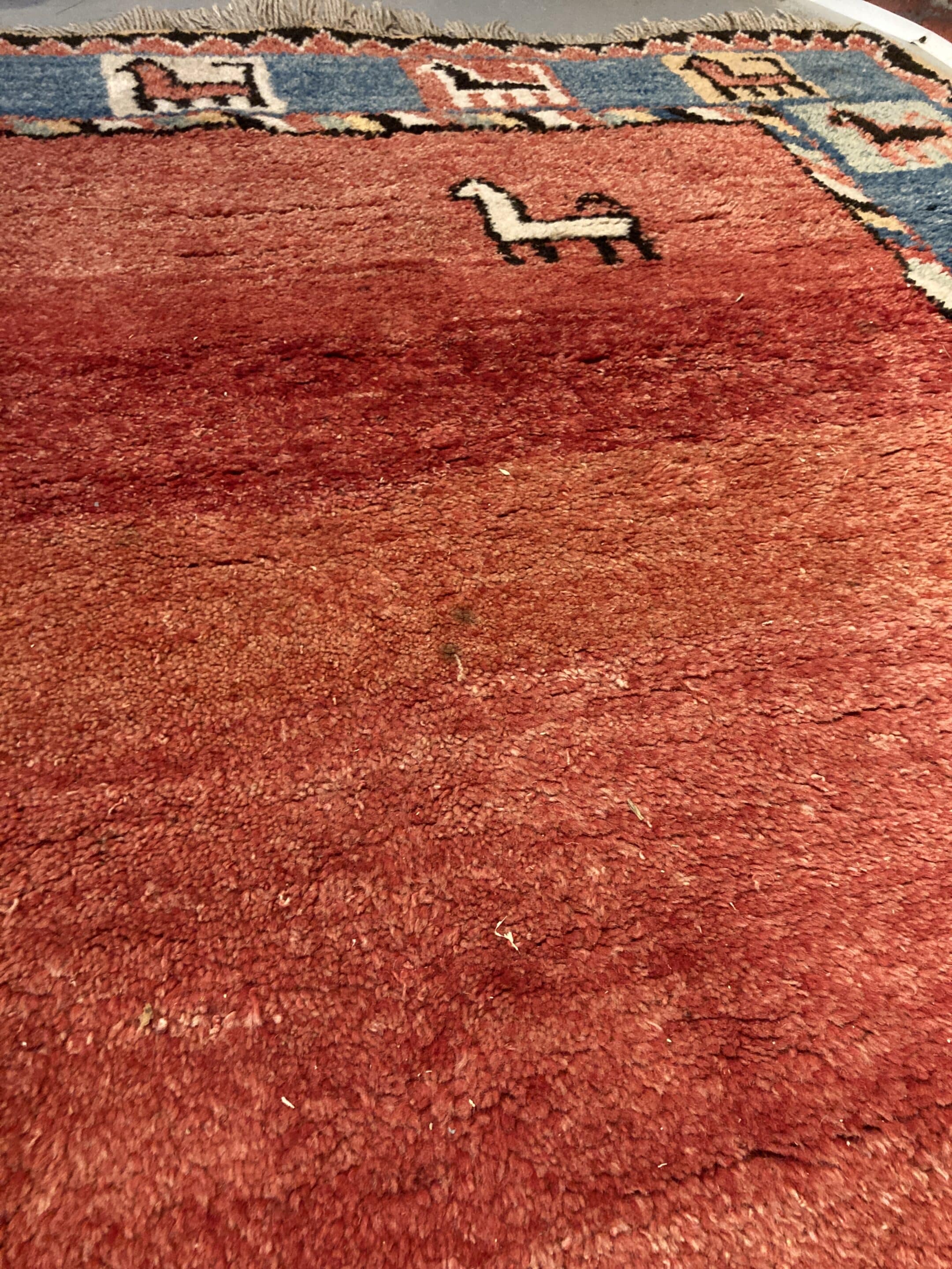 Tapis en laine rectangulaire rouge et bleu.