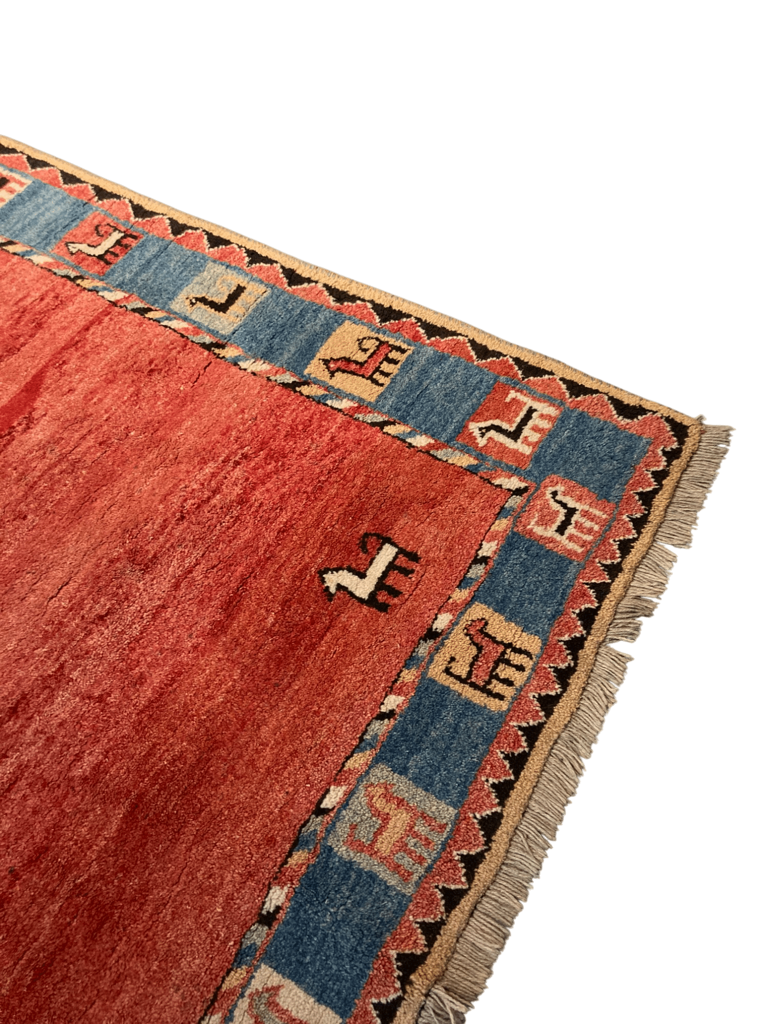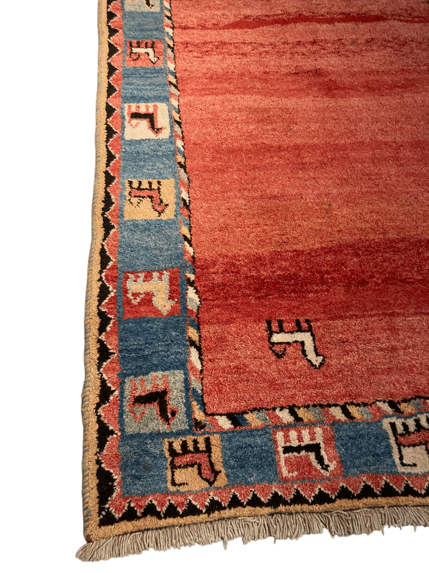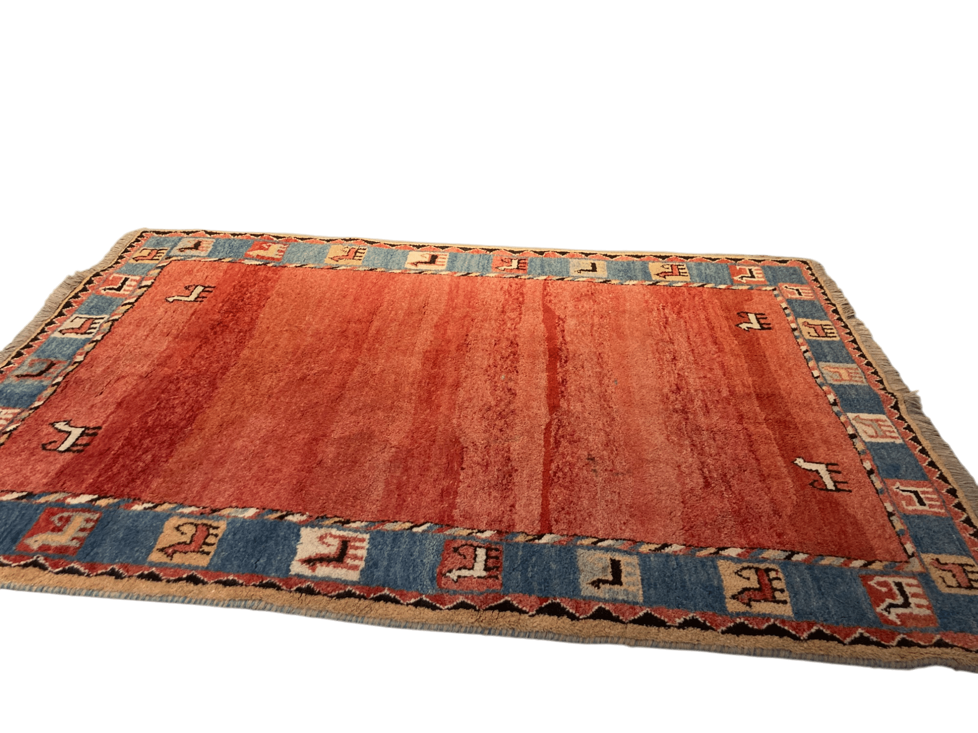 Tapis en laine rectangulaire rouge et bleu.