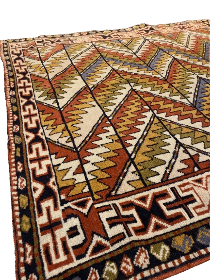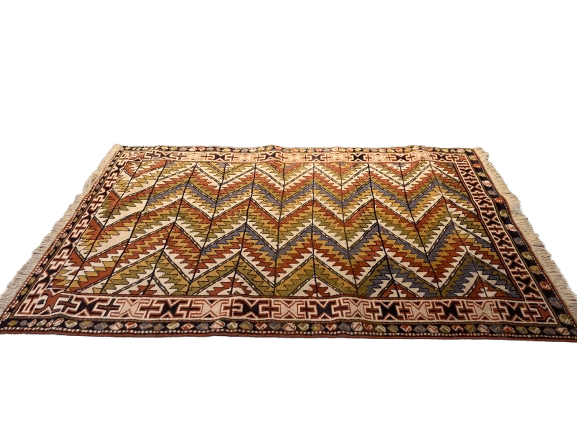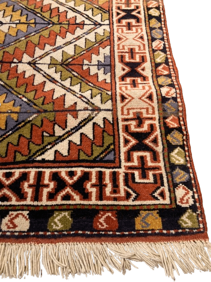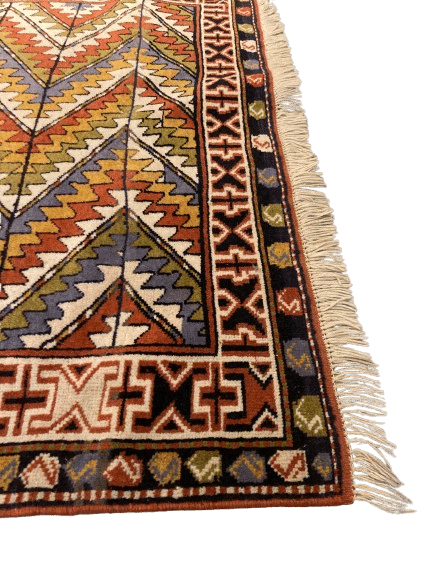 Tapis rectangulaire à franges en laine motifs géométriques multicolores.